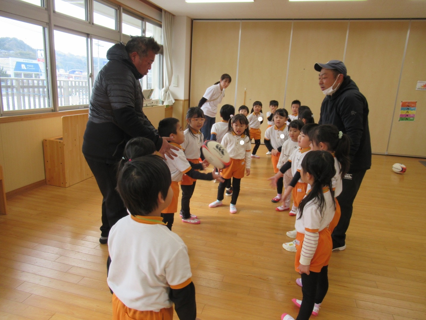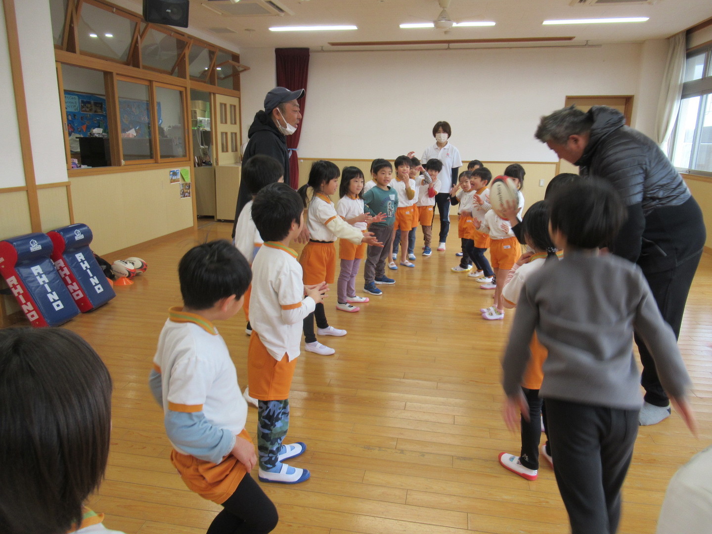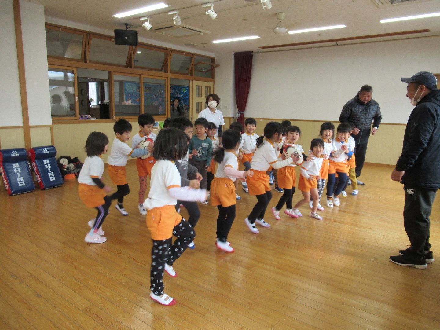 たいよう・そら組の園児たちがラグビー教室に参加しました。パスの仕方やボールは下から投げること、受け取る時の構え方などを教えてもらい、早速やってみました。ボールを持って思いっきりタックルするのも面白かったようで、みんな全力で体当たりしていましたよ。初めて体験する園児が多かったですが、みんなコーチの話を聞きながら意欲的に取り組んでいました。