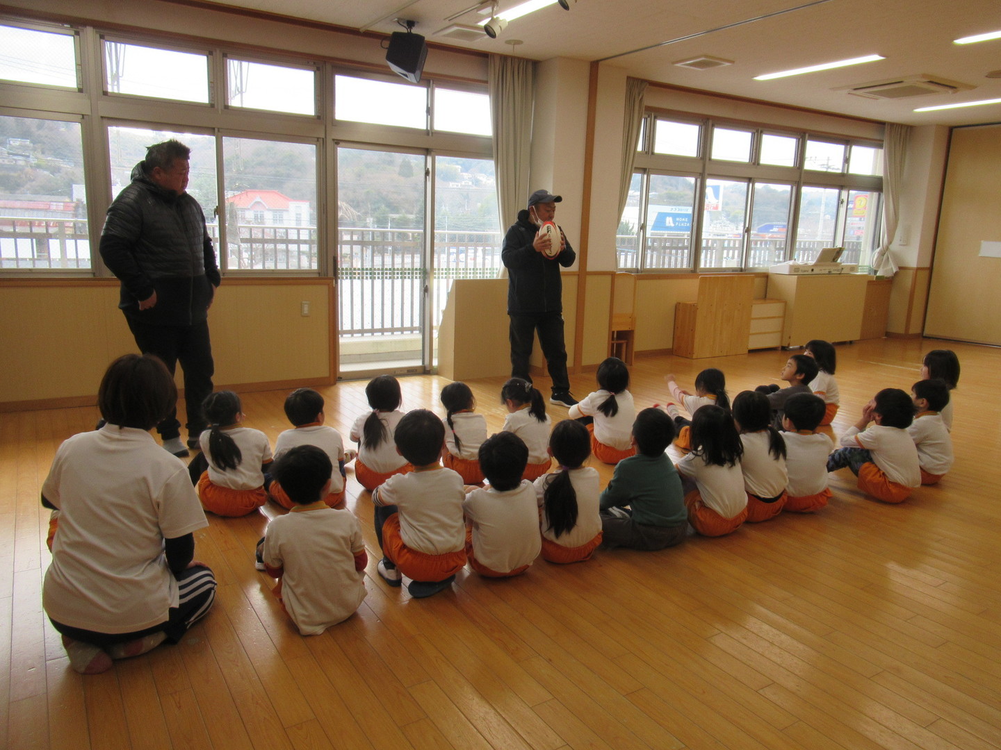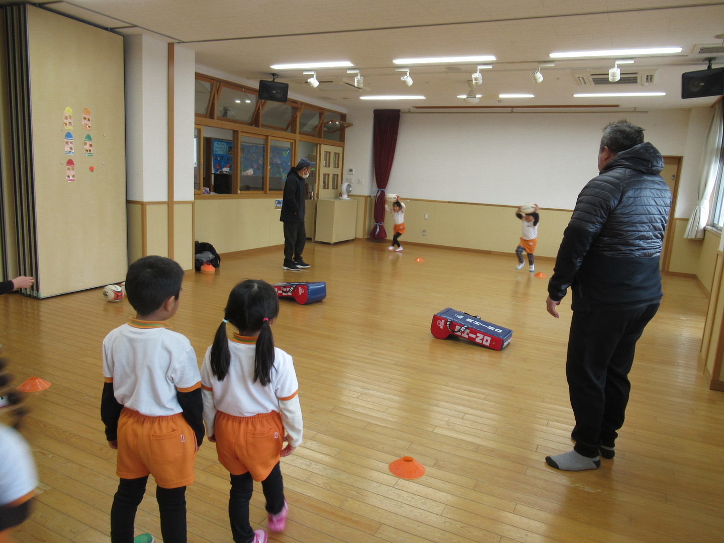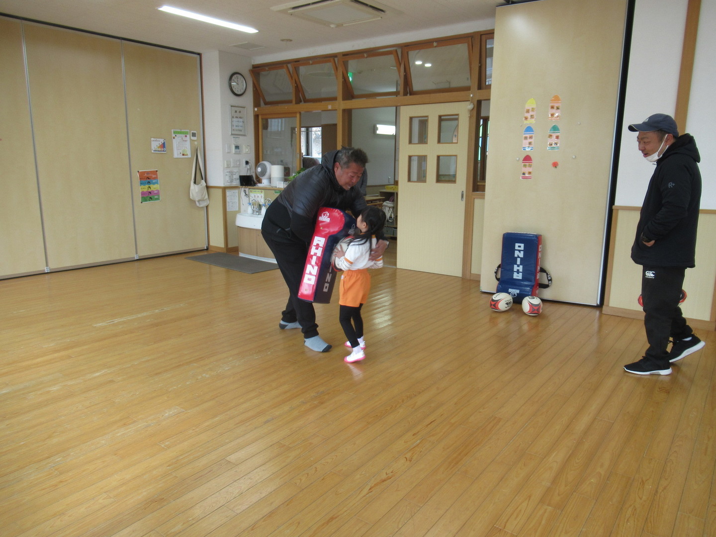 たいよう・そら組の園児たちがラグビー教室に参加しました。パスの仕方やボールは下から投げること、受け取る時の構え方などを教えてもらい、早速やってみました。ボールを持って思いっきりタックルするのも面白かったようで、みんな全力で体当たりしていましたよ。初めて体験する園児が多かったですが、みんなコーチの話を聞きながら意欲的に取り組んでいました。