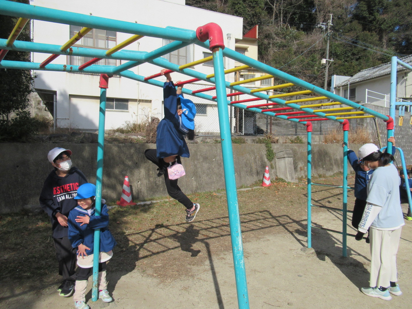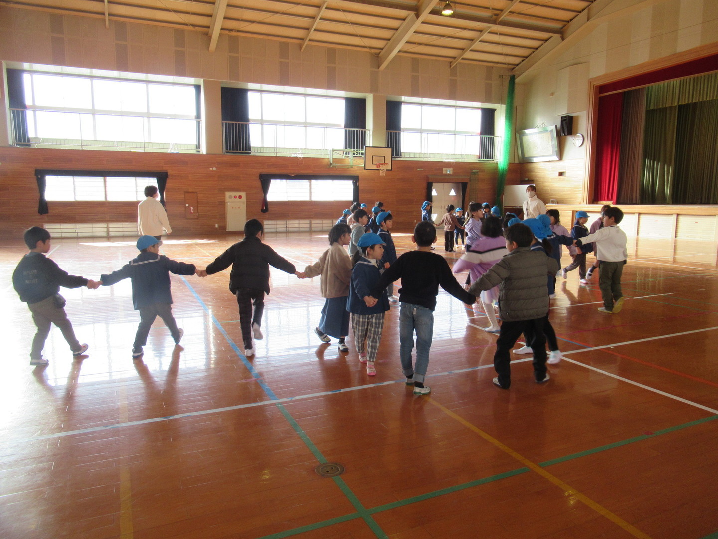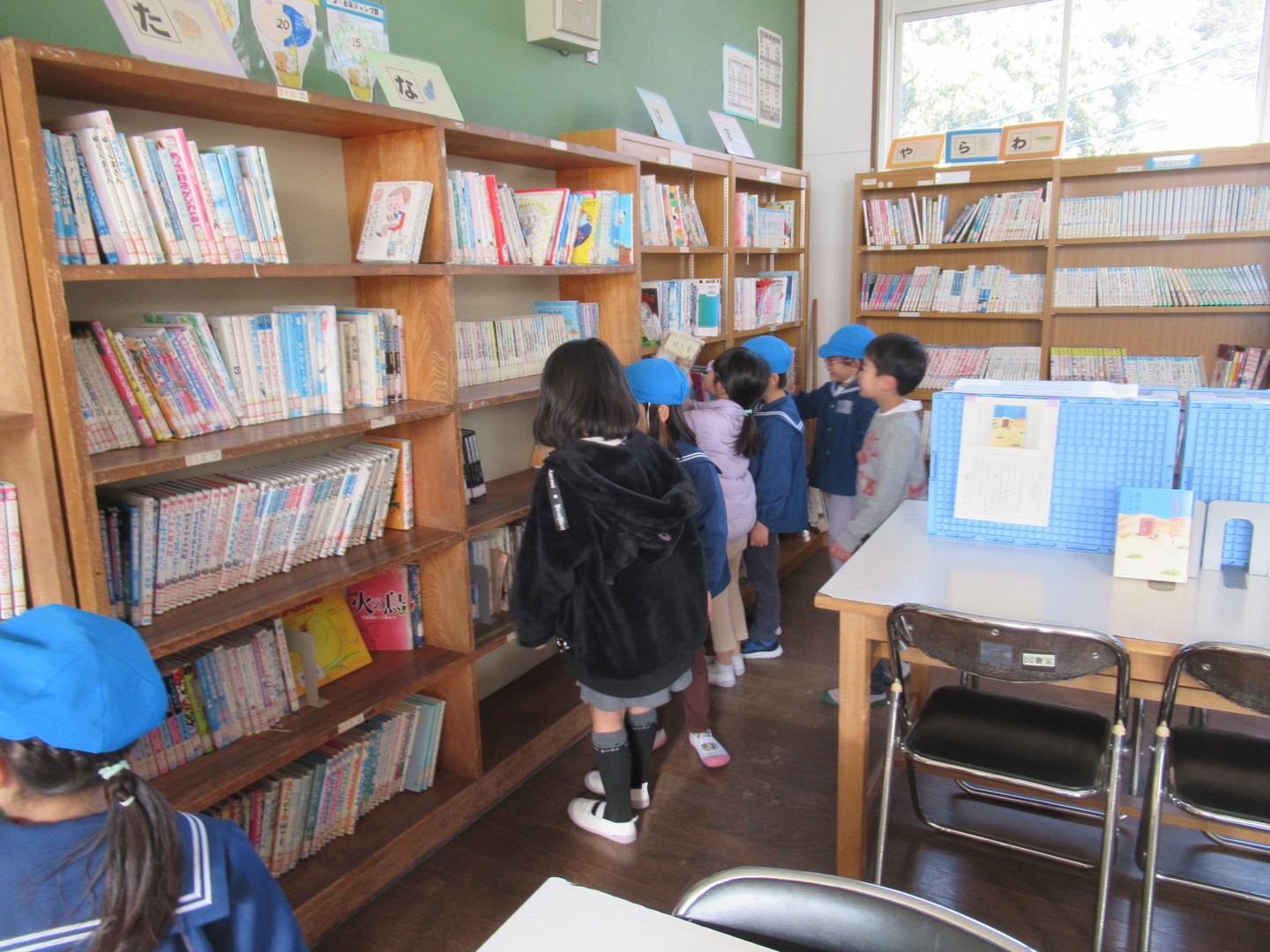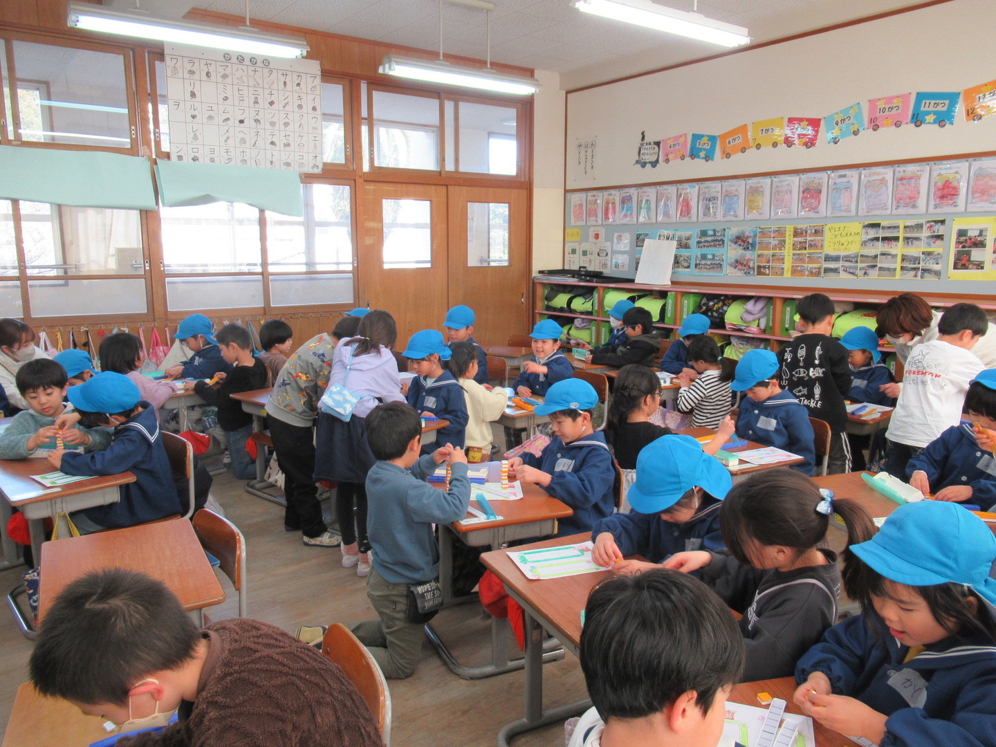 そら組さんが八幡小学校に行きました。体育館で1年生とゲームで交流した後は、職員室や図書館など校内を案内してもらいました。中休みには5年生と一緒に小学校の遊具で遊び、楽しそうな園児達でした。その後は1年生の教室に行き、朗読や合奏を聞いたり、名前を書いたり算数セットを貸してもらって遊びました。園児たちは、今日の体験を通して1年生になる楽しみが更に膨らんだようです。