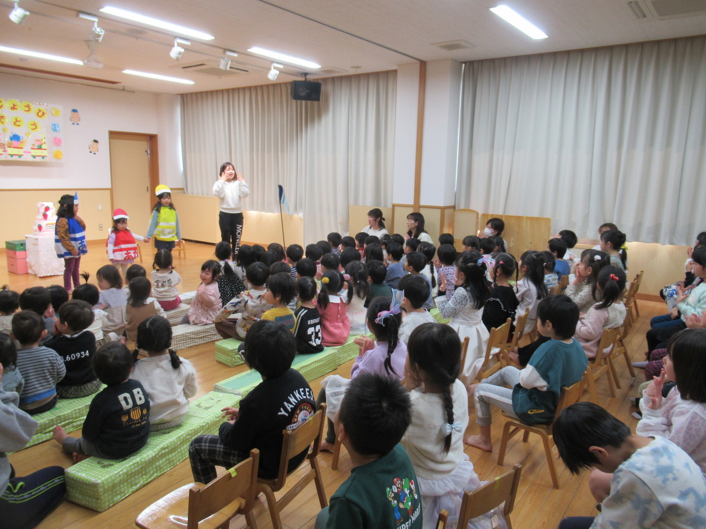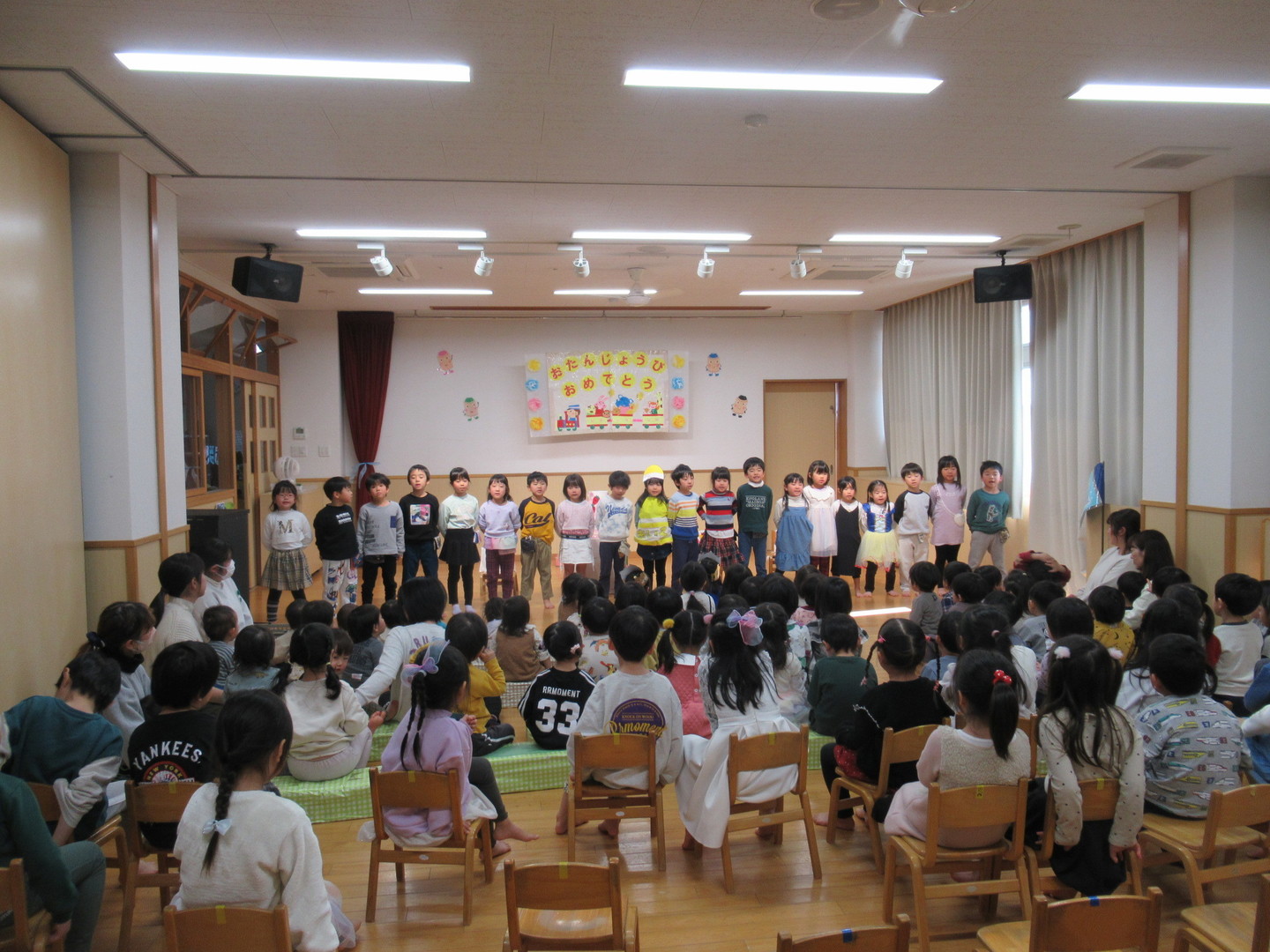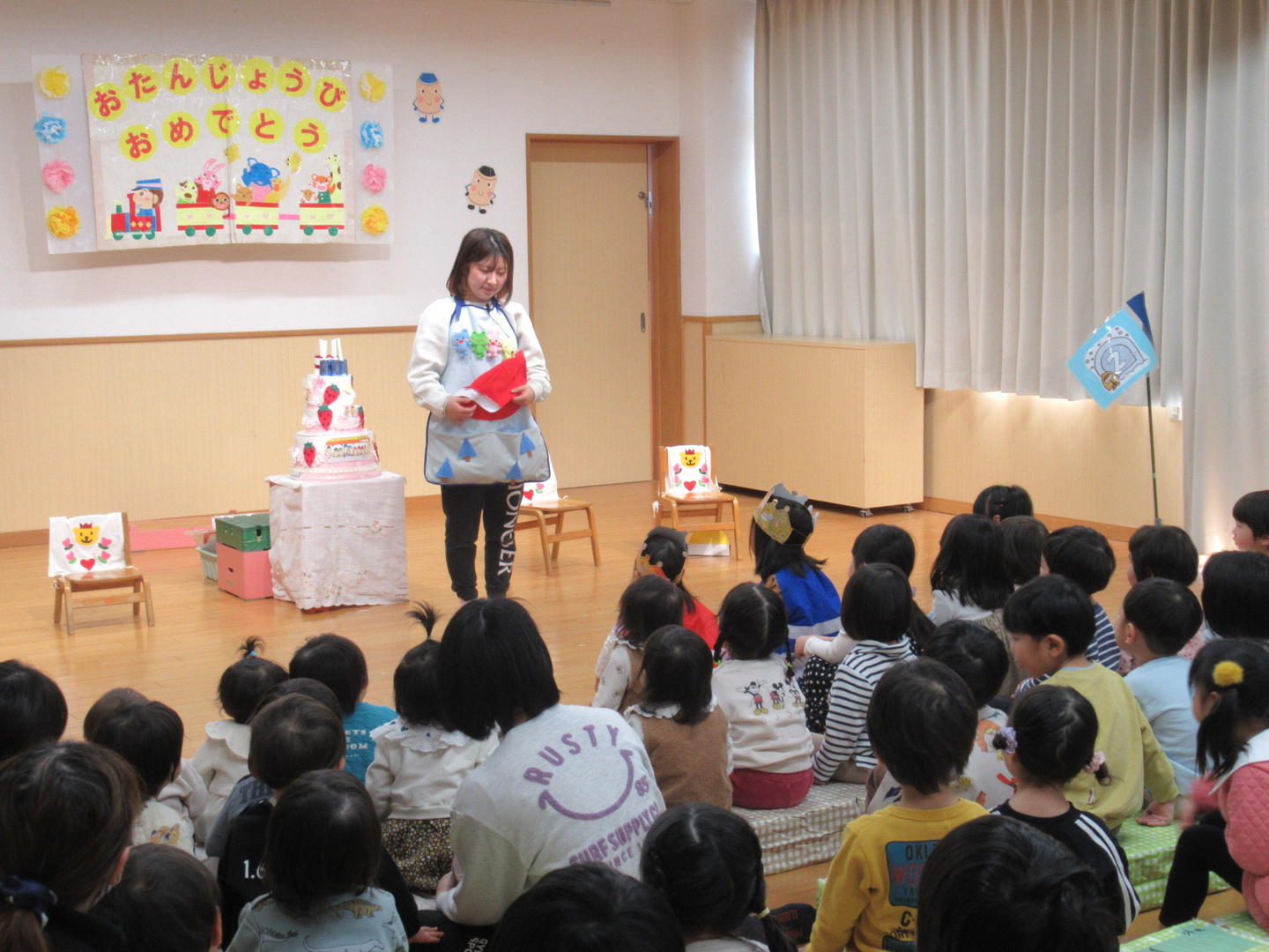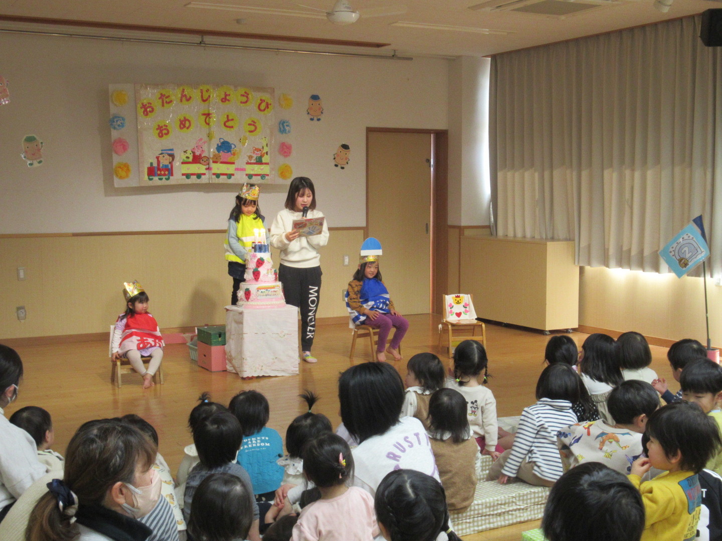 2月は3名の園児が誕生日を迎えました。ちょっぴり恥ずかしそうな様子もありましたが、ダンスとまめまき、コンコンくしゃんの歌を披露してくれました♪「てぶくろ」のエプロンシアターでは、小さい園児たちもじーっとよく見ていましたよ。最後はそら組さんからの歌のプレゼントもあり、楽しい誕生会になりました。