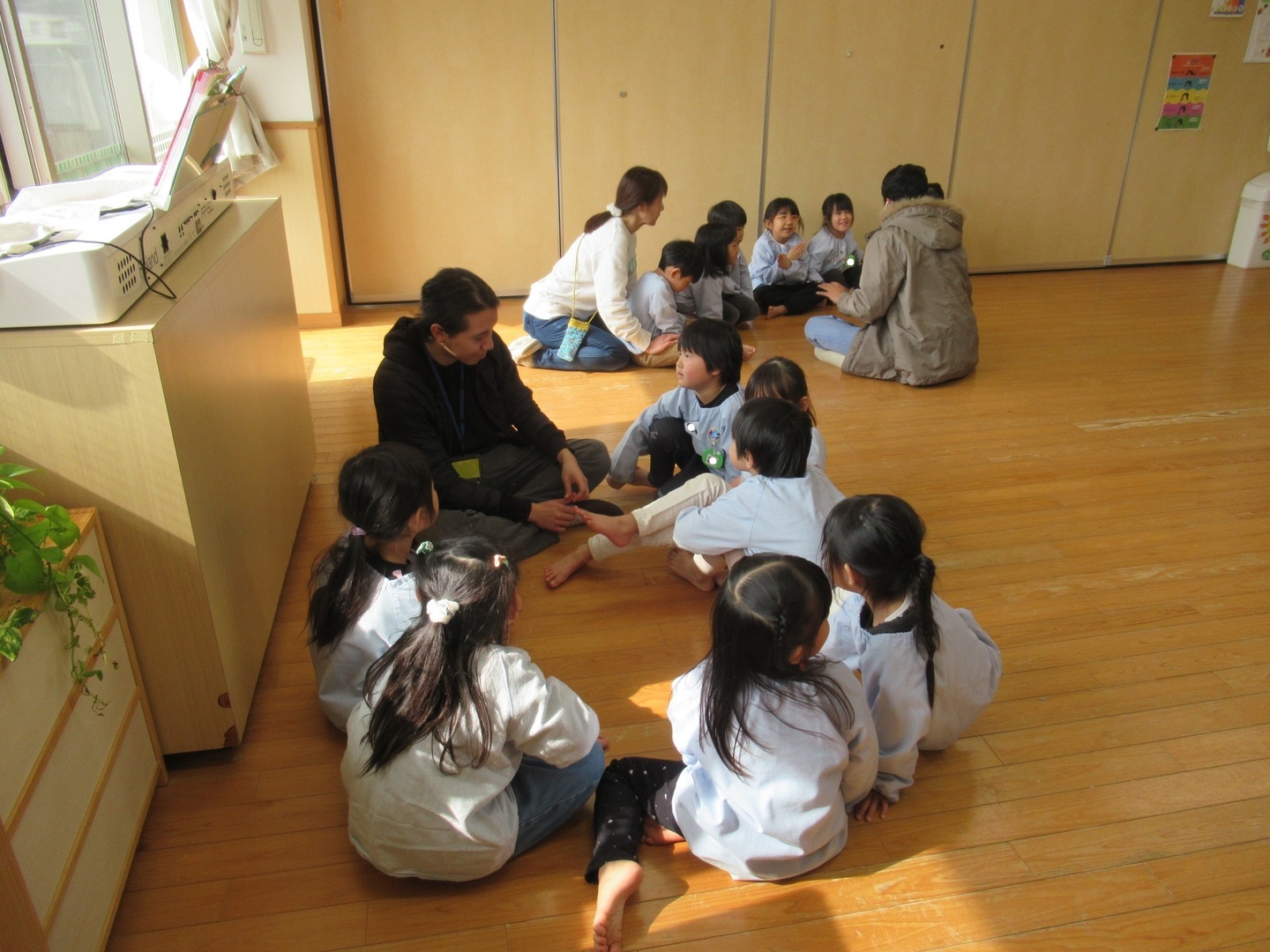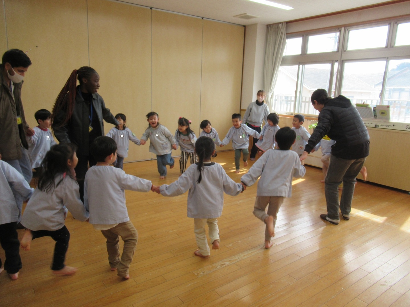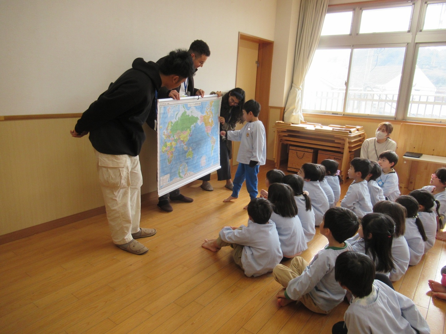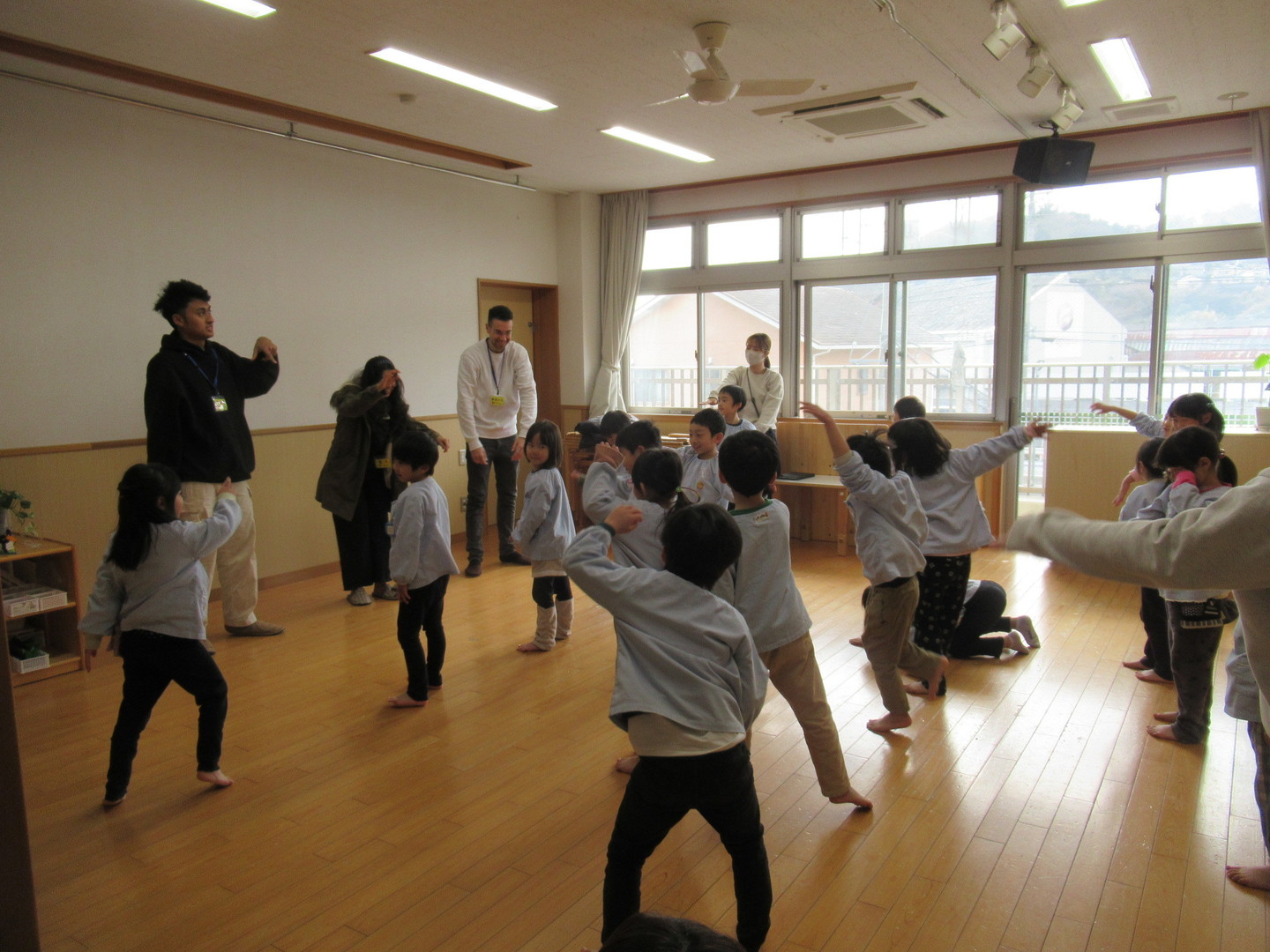 たいよう、そら組の園児たちがAPUの学生さんたちとに英語を使って交流しました。初めに世界地図を使ってどこの国から来たのかを教えてもらい、その後は英語の歌に合わせてダンスをしたり、自己紹介の仕方などを教えてもらいました。園児たちも興味を持って参加し、楽しんでいましたよ。