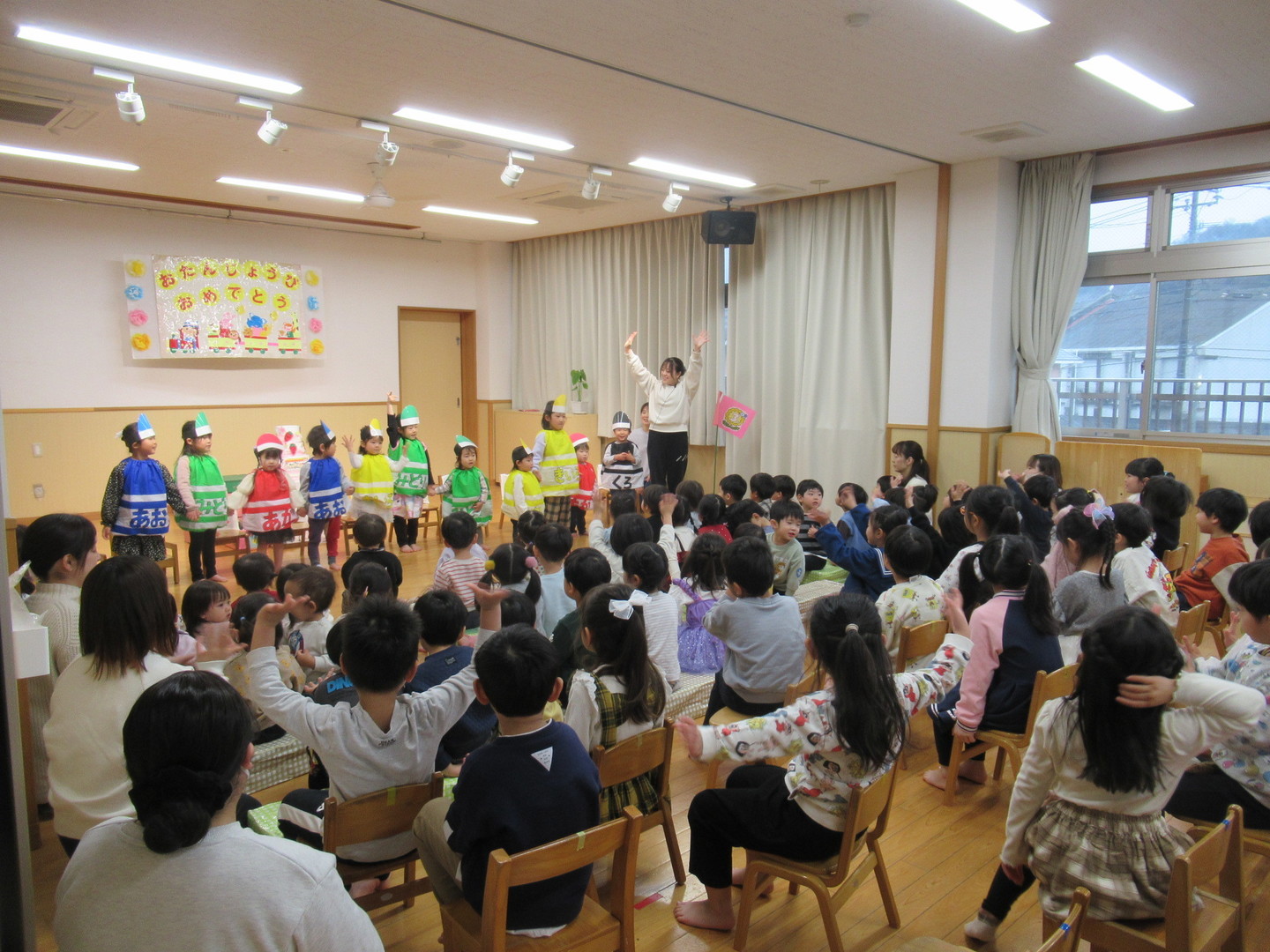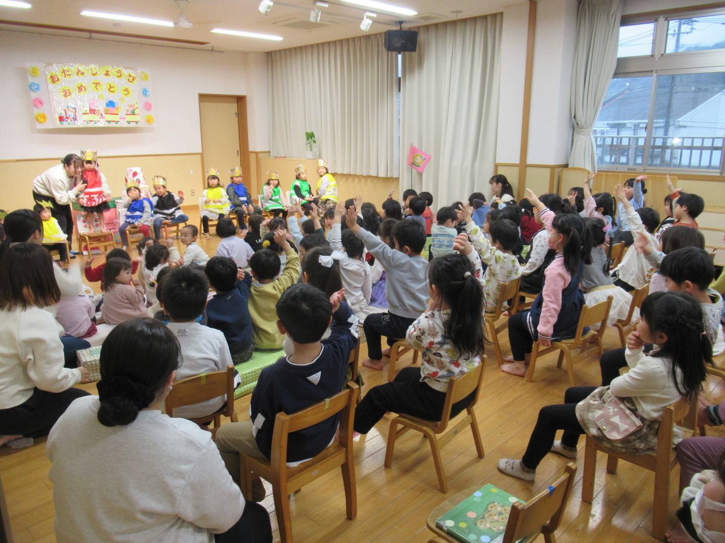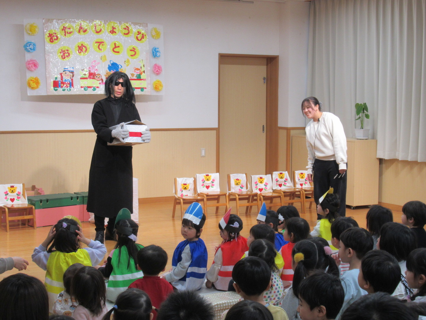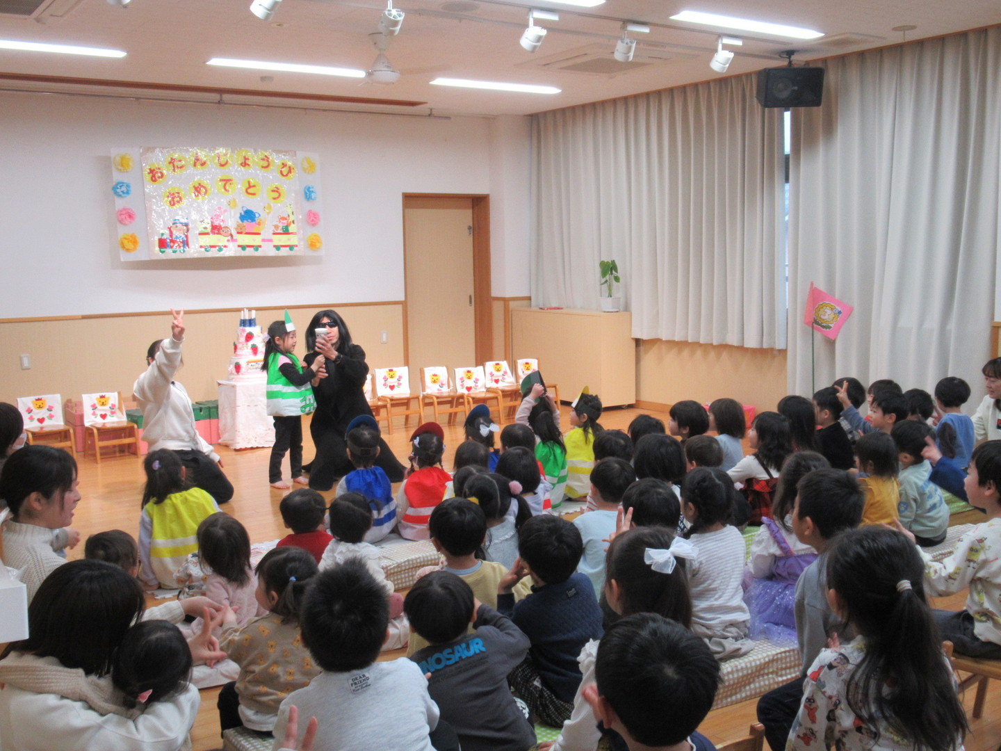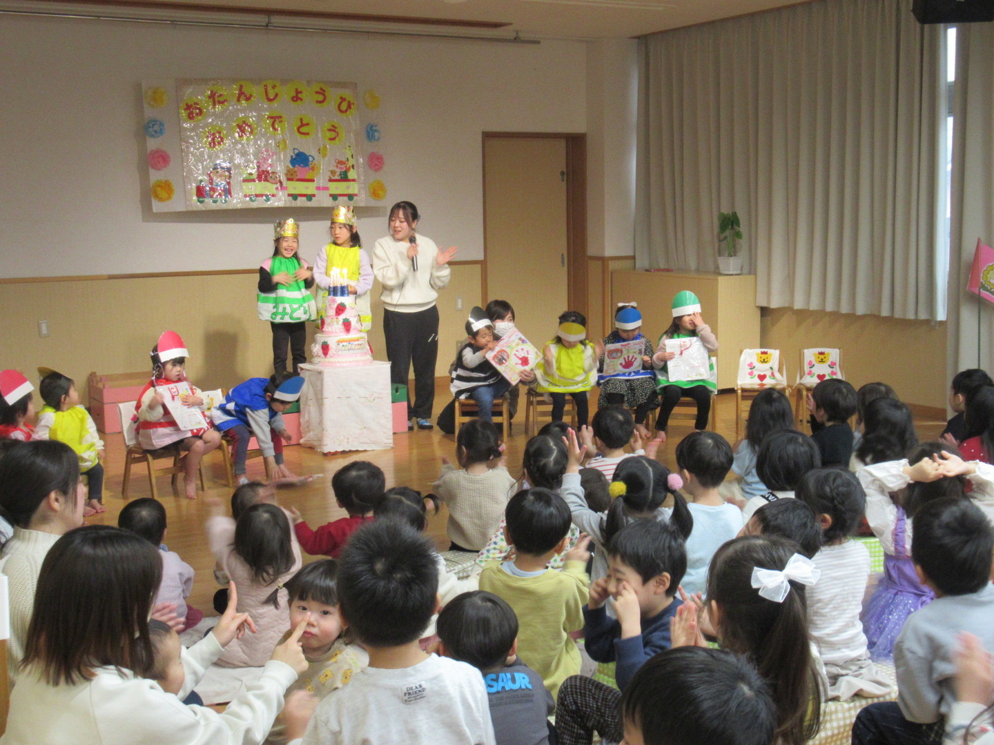 3月は11名の園児が誕生日を迎えます。みんなで手遊びをした後に、誕生児さんが好きな色のくれよんくんになって登場し、ダンスと“ちょうちょ”の歌を披露してくれました♪最後はみんなが大好きなマジックショーがあり、大盛り上がりでしたよ!今年度最後の誕生会になり、みんなひとつずつ大きくなりました。