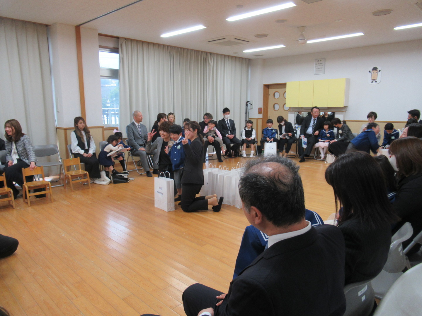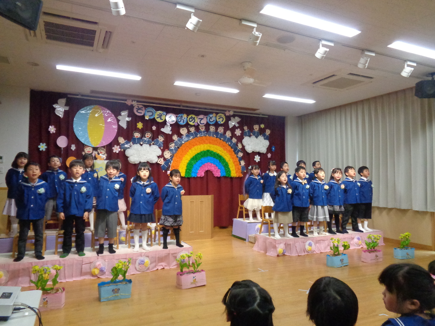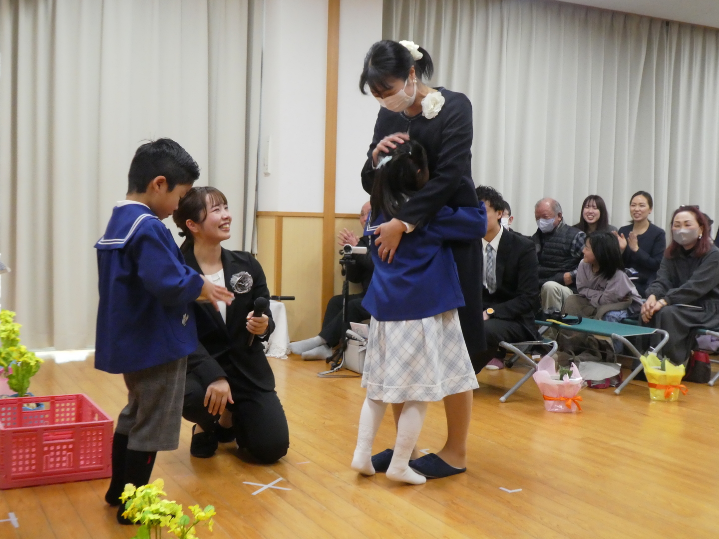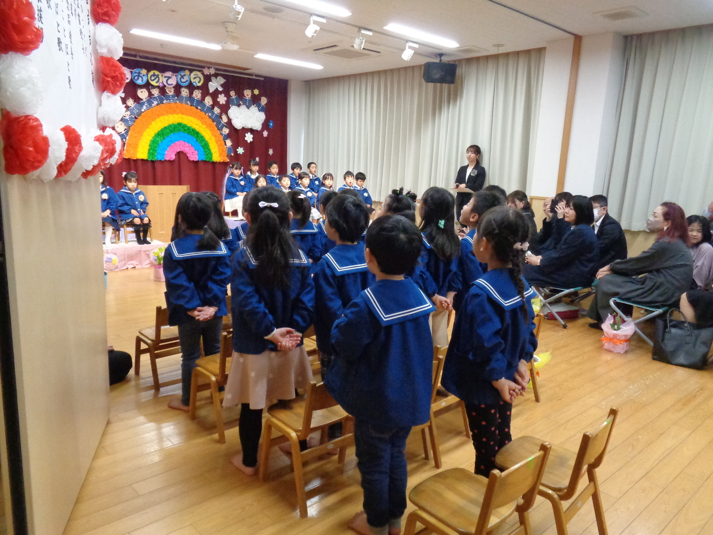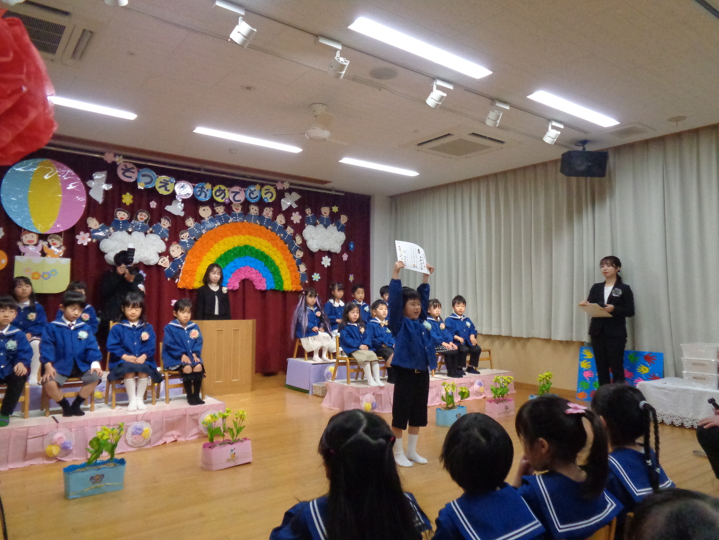 そら組21名が卒園を迎えました。いつもと違う雰囲気にちょっぴり緊張した様子も見られましたが、園長先生から一人ひとり卒園証書を受け取り、大きな声で小学校で頑張りたいことや、楽しみにしていることなどを発表したり、みんなで歌う姿を見ると、成長を感じる事ができうれしかったです。最後はお家の方へ、日頃の感謝を伝え、手作りの写真立てをプレゼントしました。
