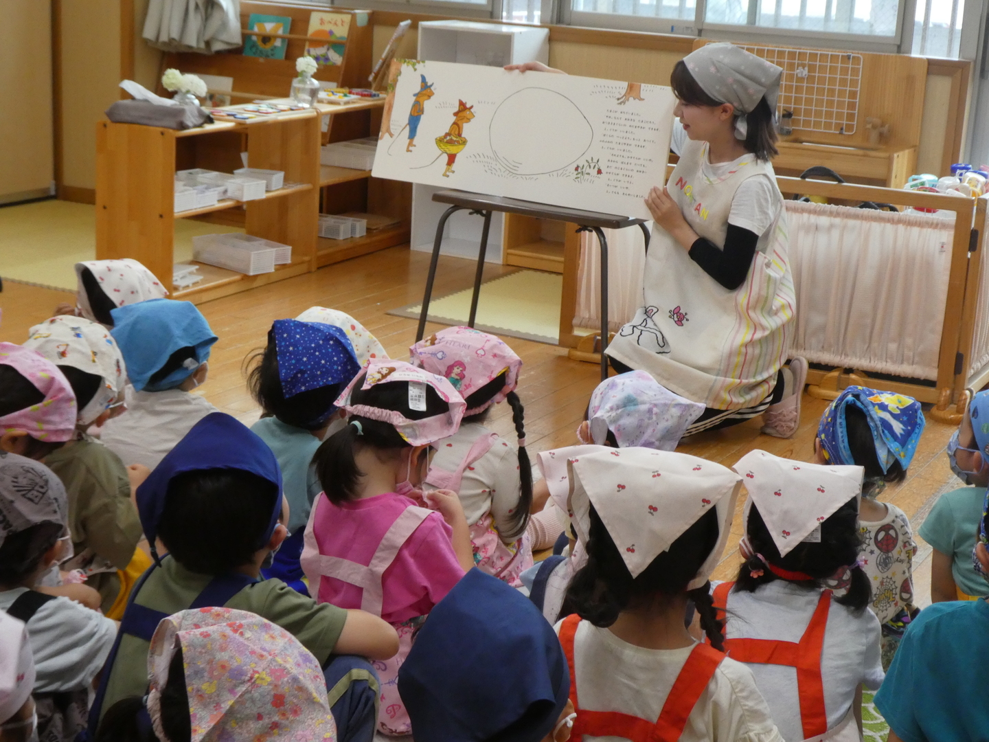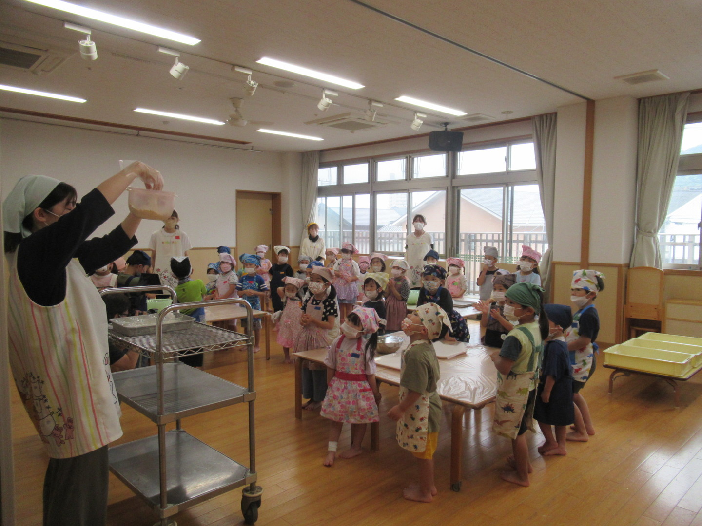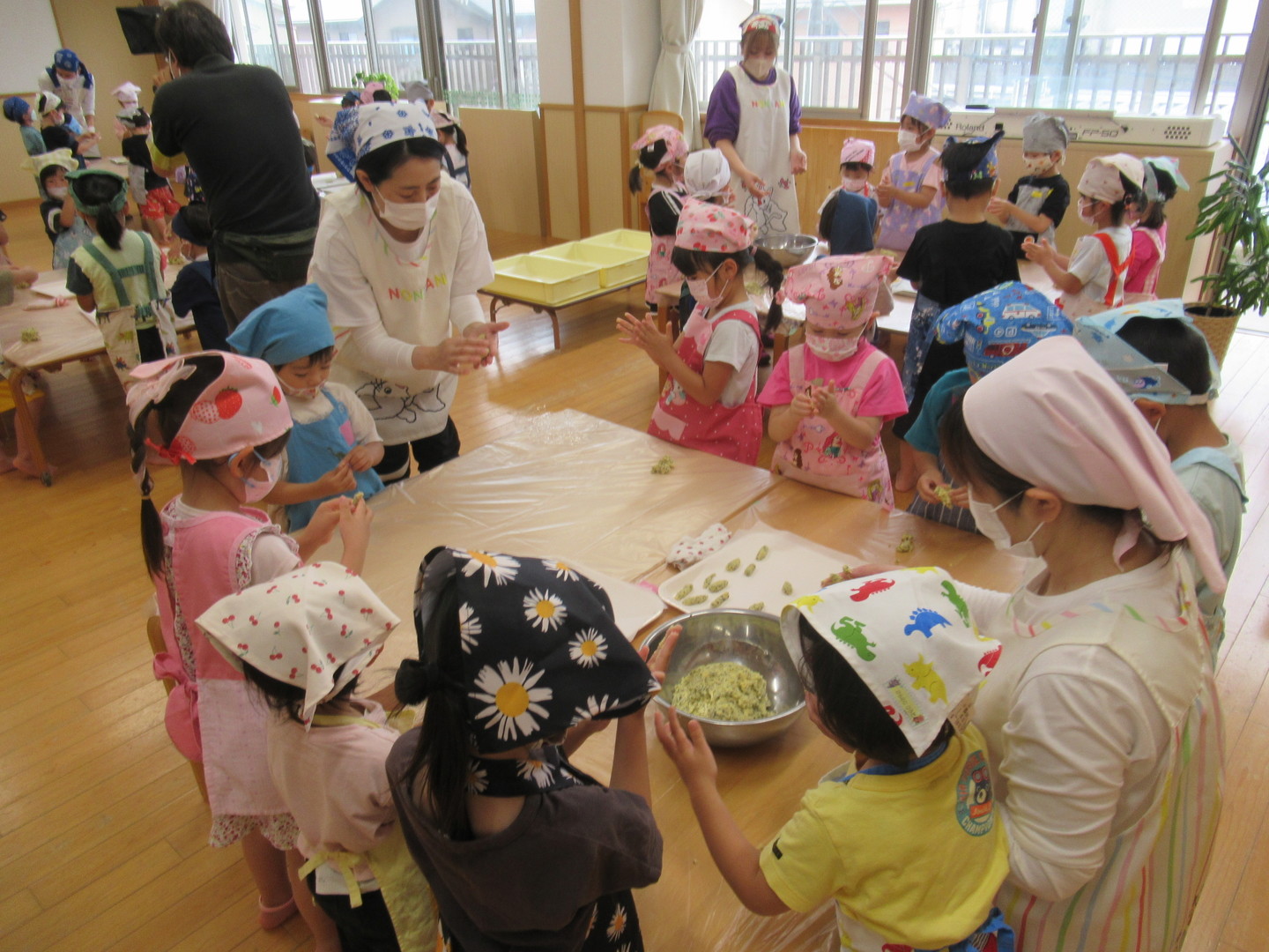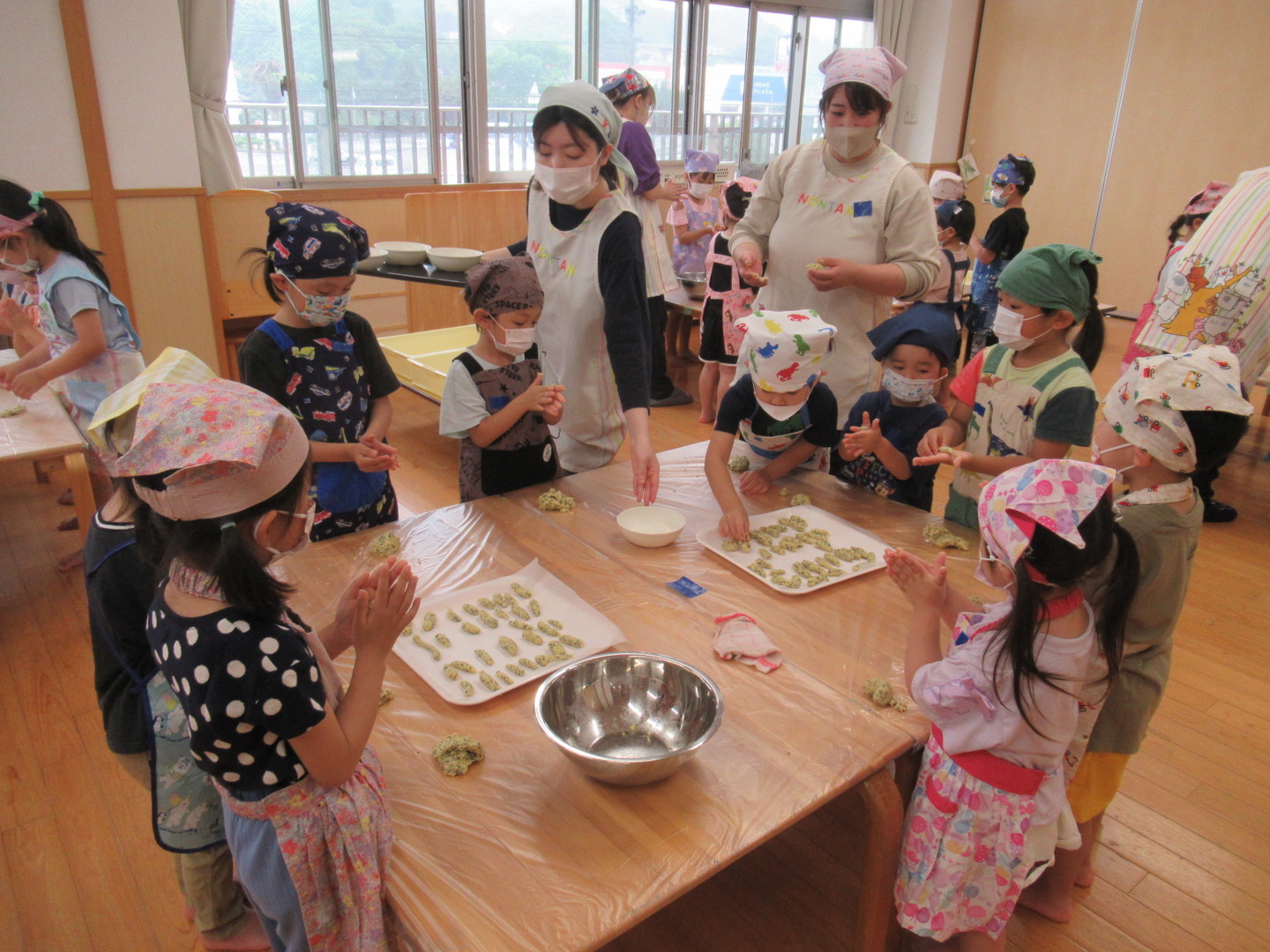 以上児クラスの園児たちがかりんとう作りをしました。初めに「ぐりとぐら」の絵本を読んでクッキングに興味が持てるようにし、調理の職員からどんな材料を入れるのか?どうやって作るのかを教えてもらいました。生地をもらうと大きさを確認しながら、楽しそうに細長く伸ばして作っていましたよ。油で揚げてできあがるといい匂いがして大喜び!出来立ては特別おいしかったようです。今日作ったかりんとうは、お迎え時にお家の方にプレゼントします!