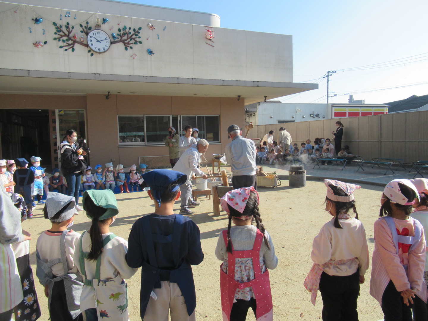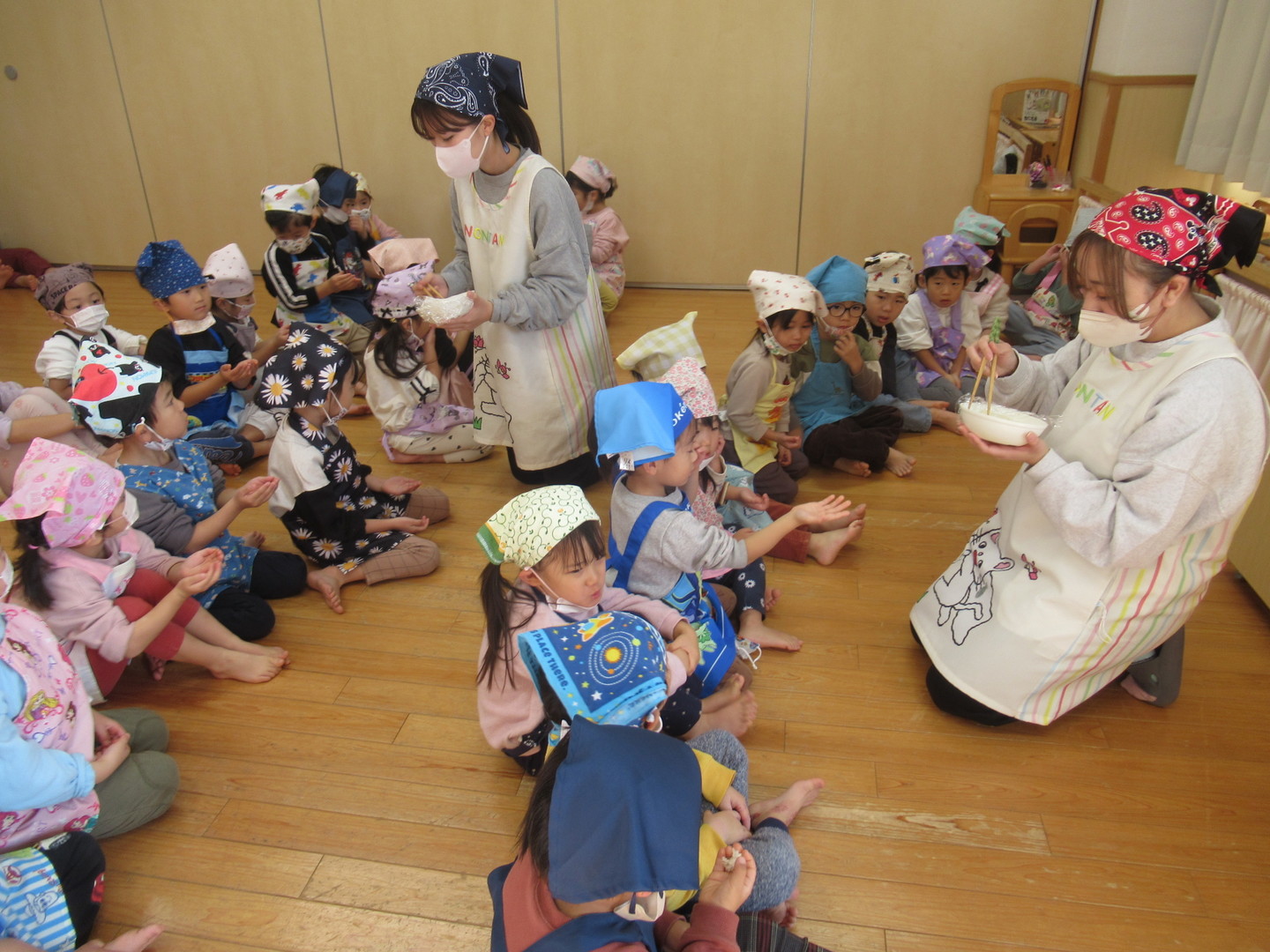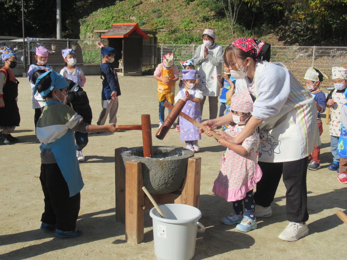おじいちゃんおばあちゃんと一緒におもちつきをしました。初めにもち米を食べ、このお米がおもちになることを知らせ、おじいちゃんたちに手伝ってもらいながら臼と杵でつくと、だんだん柔らかくなりおいしそうなおもちができました!おばあちゃんたちに教えてもらいながら上手に丸め、自分で作ったあんこ餅を嬉しそうに食べていましたよ。