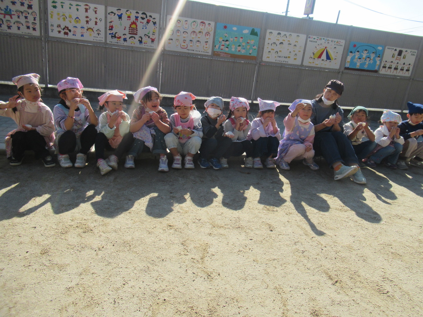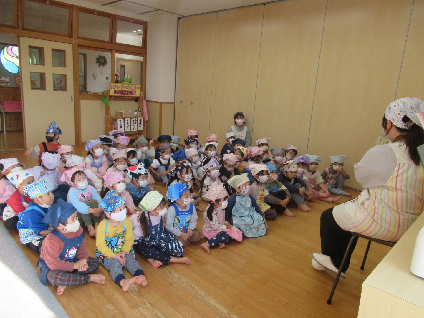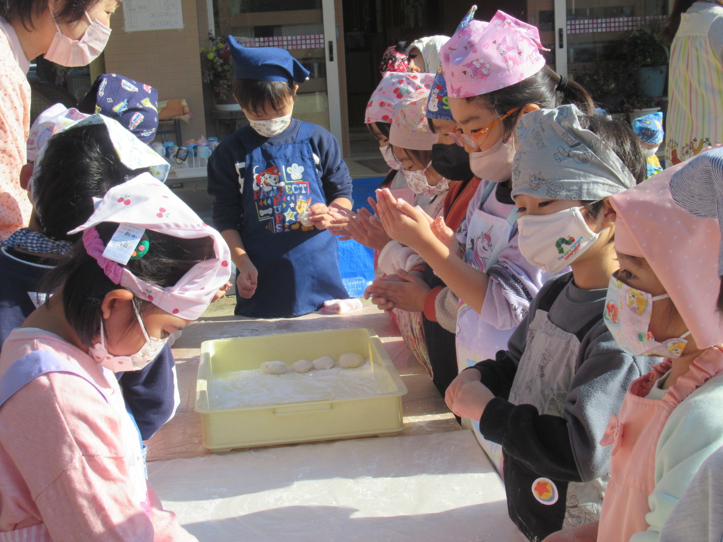 おじいちゃんおばあちゃんと一緒におもちつきをしました。初めにもち米を食べ、このお米がおもちになることを知らせ、おじいちゃんたちに手伝ってもらいながら臼と杵でつくと、だんだん柔らかくなりおいしそうなおもちができました!おばあちゃんたちに教えてもらいながら上手に丸め、自分で作ったあんこ餅を嬉しそうに食べていましたよ。